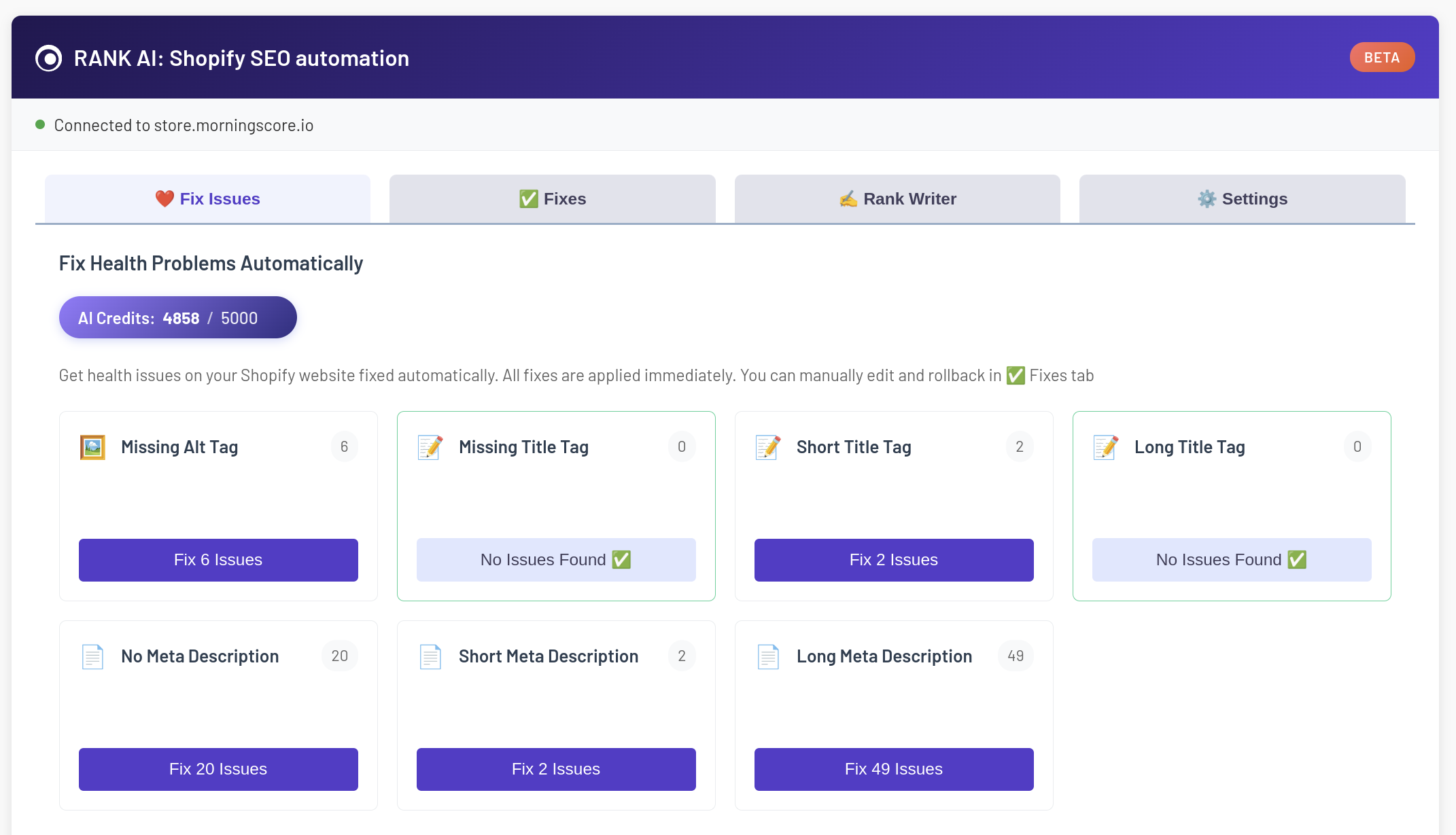 Issues are fetched from Morningscore’s Health API in the admin panel where users select an issue type (missing titles, meta descriptions, or alt tags). The app then calls the Morningscore AI API to generate fixes, consuming 1 AI credit per fix.