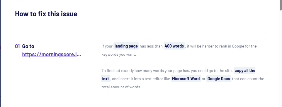 - We instantly open the dashboard and show you a prioritized list of pages that are too empty to rank.